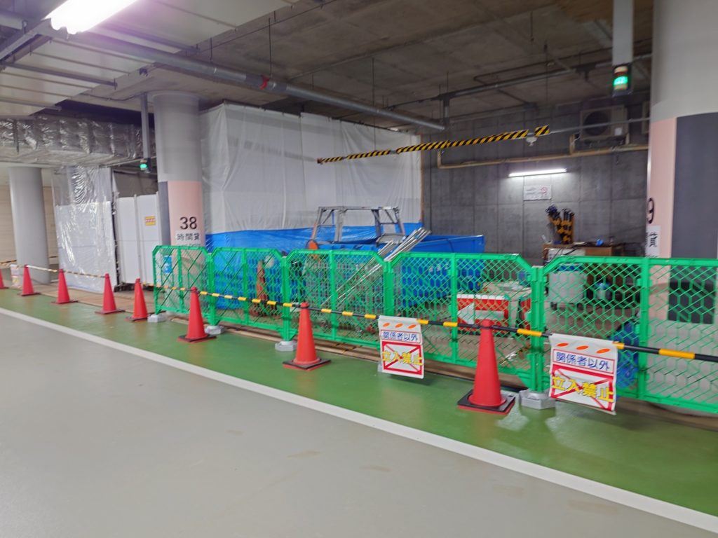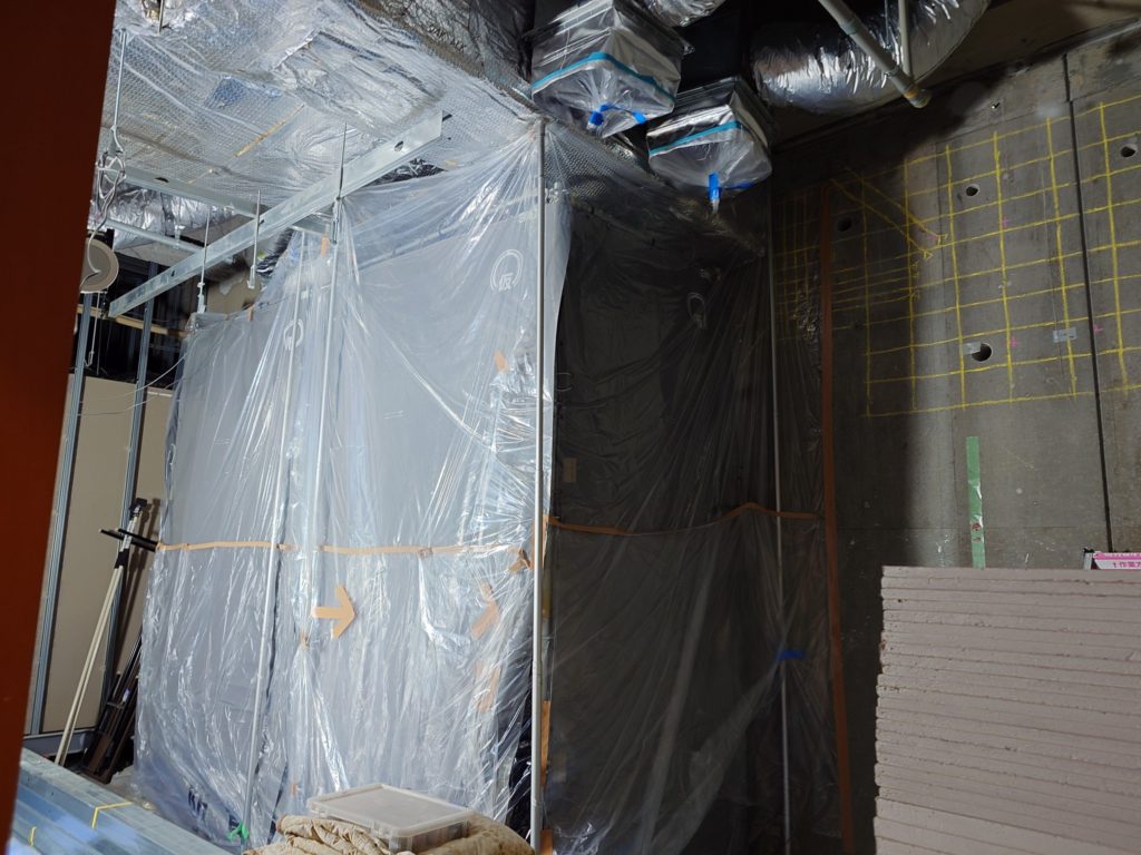 MRIのシールドが運び込まれ、コア抜きに伴う粉塵対策も施工、いよいよ明日1日夜から工事が本格化します。